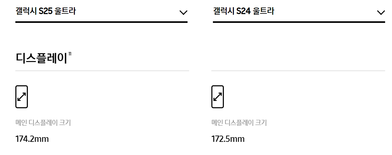 핸드폰의 두께도 갤럭시 S25 울트라가 갤럭시 S24 울트라보다 0.4mm 얇아졌습니다.