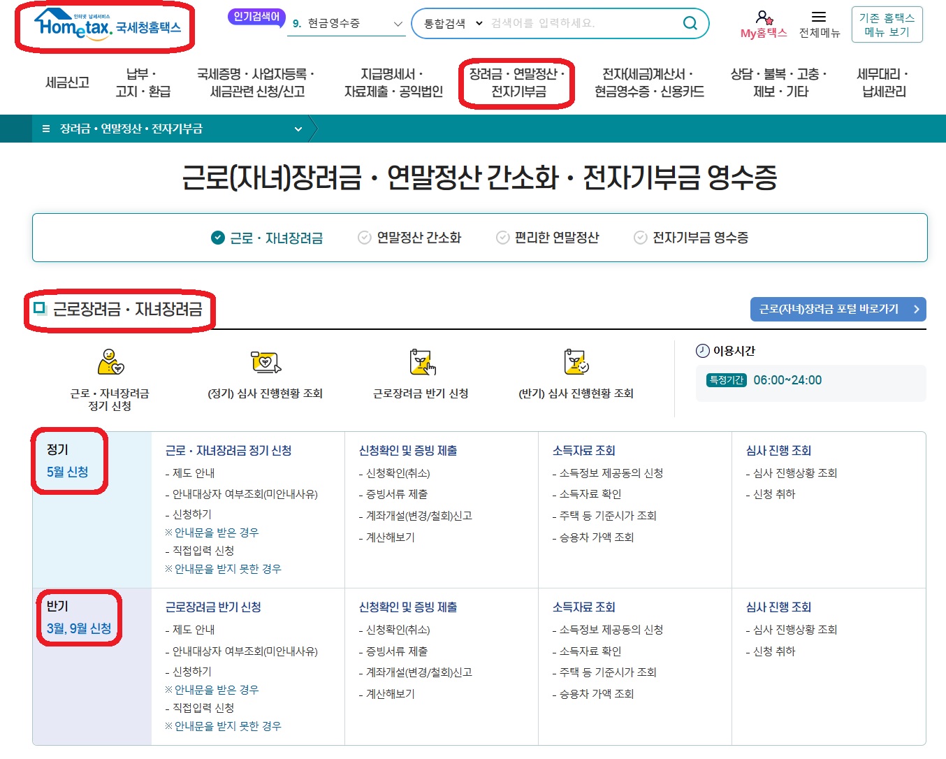 홈택스 접속 → 신청/제출 → ‘근로·자녀장려금’ → 근로장려금(정기/반기) 신청 → 개별인증번호·주민등록번호 뒤 7자리 입력 → 신청완료