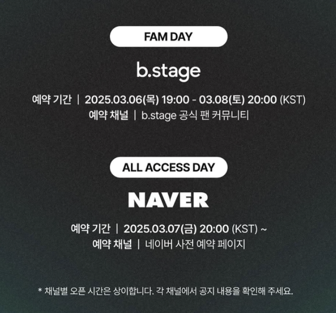 🔸팬클럽 회원 선예약: 2025. 3. 6.(목) 오후 7시 ~ 3. 8.(토) 오후 8시