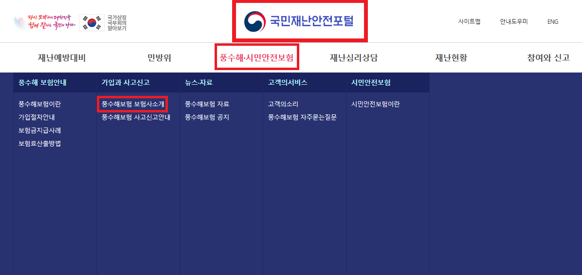 풍수해보험은 행정안전부에서 보험료의 일부를 보조하고 국민은 저렴하게 보험을 가입하여 예기치 못한 풍수해(태풍, 홍수, 호우, 해일, 강, 풍랑, 대설, 지진)에 대해 대처할 수 있도록 보험료의 70~100% 지원해 주는 제도입니다.